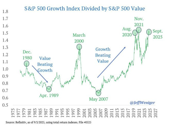 The ratio of S&P 500 Growth to Value in the US has hit a new record high, surpassing the peak of the meme stock bubble in 2021.