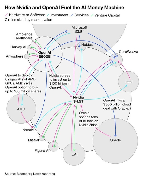 OpenAI with 4.3b revenues in the first half of 2025 announces an investment/partnership with AMD and the stock went up 101b at one point on that news. Nvidia is now at 4.5 Trillion in market cap. OpenAI spent more on marketing and equity options than it made revenue in the first half of 2025.